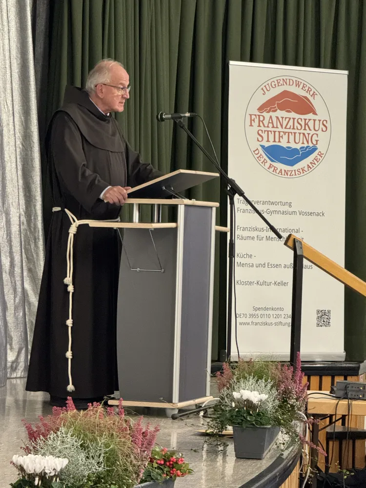 Ein besonderer Höhepunkt des Abends war die Premiere des neuen Stiftungsfilms, der mit viel Applaus bedacht wurde. Für den inhaltlichen Schwerpunkt sorgte anschließend Pater Peter Schorr O.F.M., der in seinem Vortrag „Wer ist Gott, an den ich glaube? Zur Spiritualität des heiligen Franziskus“ zentrale Gedanken franziskanischer Spiritualität darlegte.